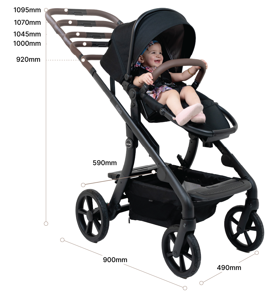 Designed for newborns up to 22kg, it features a new harness system with a magnetic buckle for secure fastening, adjustable foot support, and a stylish tan leatherette bumper bar. The extendable hood provides UPF50+ protection, a pop-out visor, and a viewing window for added comfort and functionality.